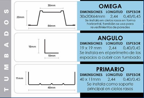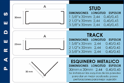 | Tipo Drywall | ESQUINERO METALICO 30X2.44, STUD 1 5/8X2.44X0.40, STUD 1 5/8X2.44X0.45, STUD 2 1/2X2.44X0.40, STUD 2 1/2X2.44X0.45, STUD 3 5/8X2.44X0.40, STUD 3 5/8X2.44X0.45, TRACK 1 5/8X2.44X0.40, TRACK 1 5/8X2.44X0.45, TRACK 2 1/2X2.44X0.40, TRACK 2 1/2X2.44X0.45, TRACK 3 5/8X2.44X0.40, TRACK 3 5/8X2.44X0.45 |