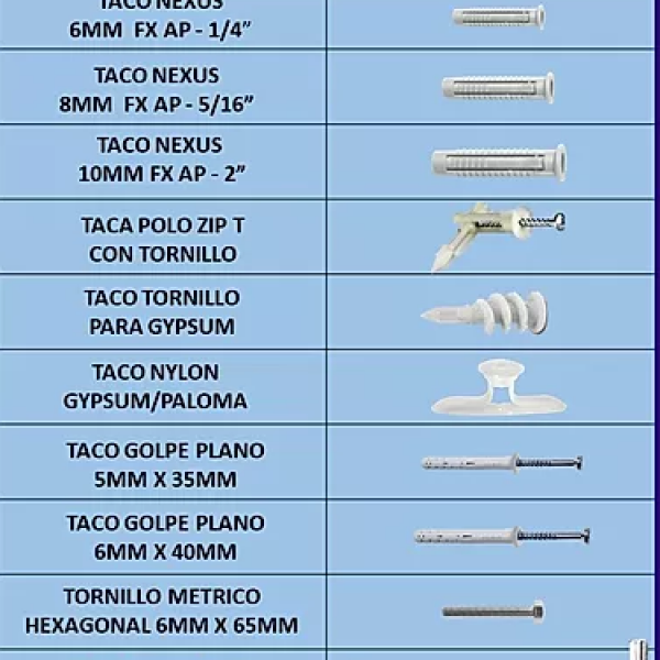 | Tipo Tornillo | TORNILLO METALICO EXAGONAL 6MM * 65MM AP 1/4 X2 9/16, TORNILLO P/AGUDA CP 7*2, TORNILLO P/BROCA FIBROCEMENTO 4.2 X 1 1/2, TORNILLO P/BROCA FIBROCEMENTO 8X1, TORNILLO P/BROCA FIBROCEMENTO 8X1 1/4, TORNILLO P/ESTRUC P/AGUDA C/P 8X1/2, TORNILLO P/ESTRUCTURA P/BROCA C/P 8X1/2, TORNILLO P/PLANCHA BROCA AQUAPANEL 8X1, TORNILLO P/PLANCHA P/AGUDA 6X1, TORNILLO P/PLANCHA P/AGUDA CP 7X1-1/2, TORNILLO P/PLANCHA P/BROCA 6X1 1/4, TORNILLO P/PLANCHA P/BROCA C/GR 6X1 1/4, TORNILLO PH CON ALETA 8X1-1/2, TORNILLO PH CON ALETA 8X1-1/4, TORNILLO PLACHA P/ AGUDA 6*2, TORNILLOS P/ PLANCHA EN TIRILLA 6*1 |